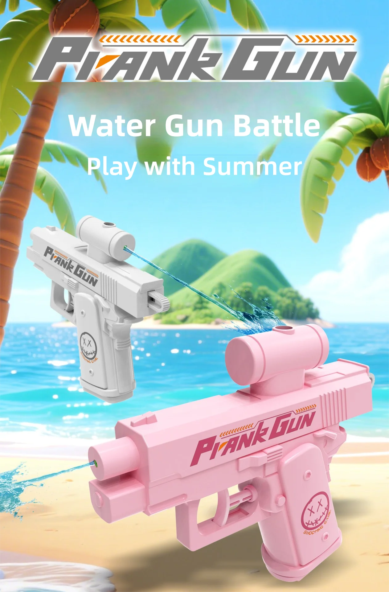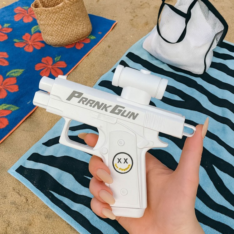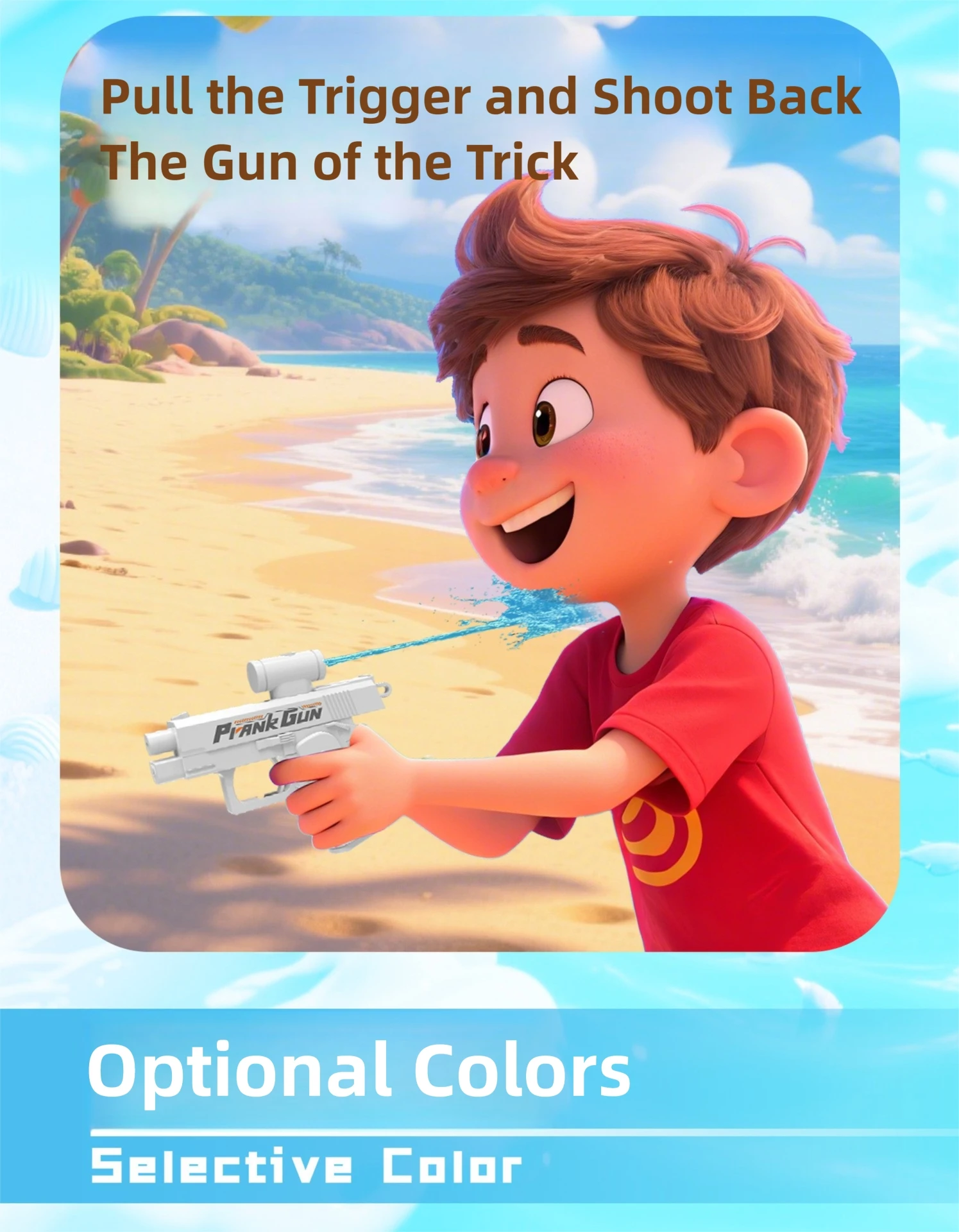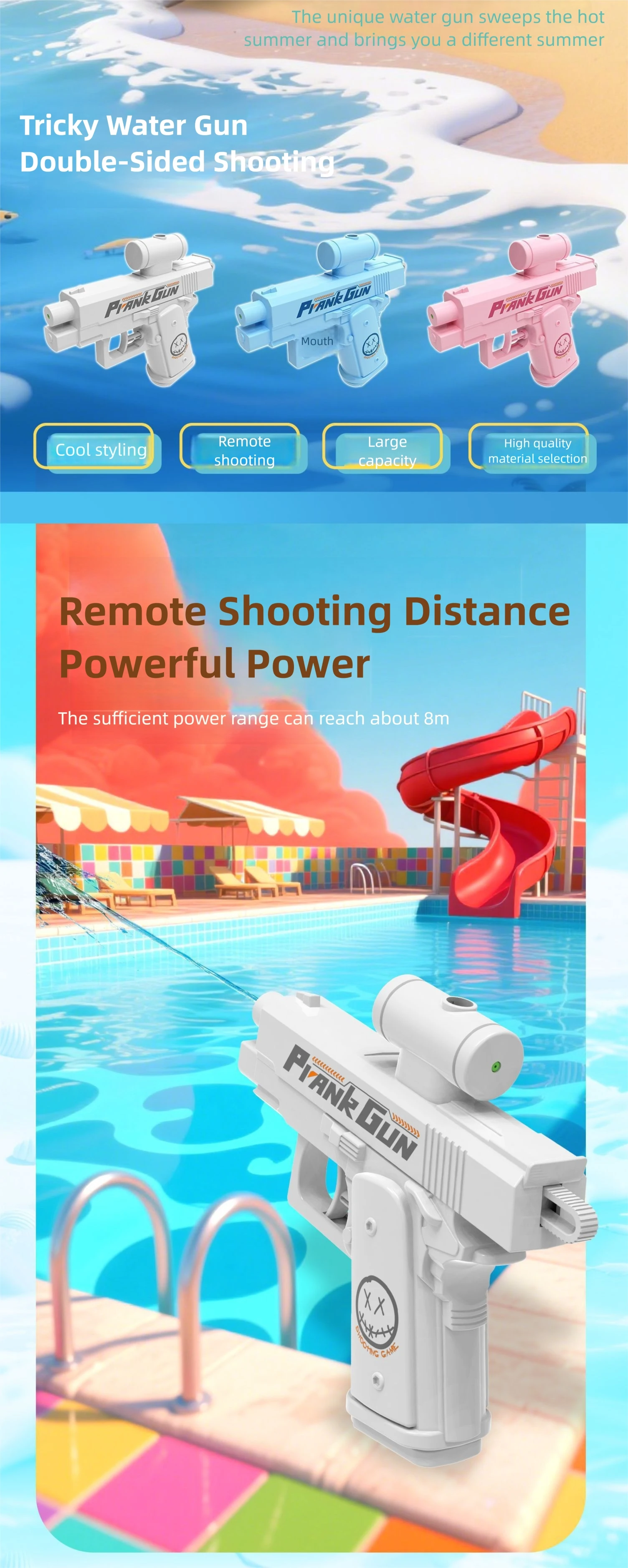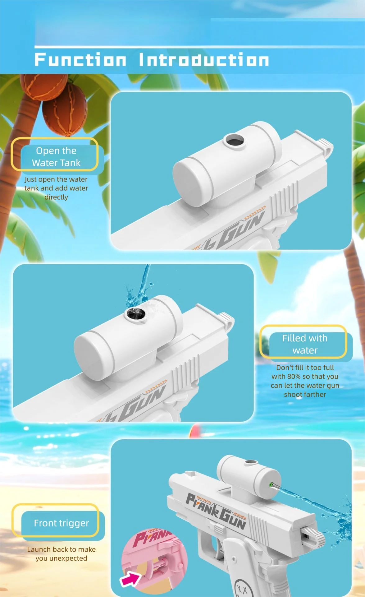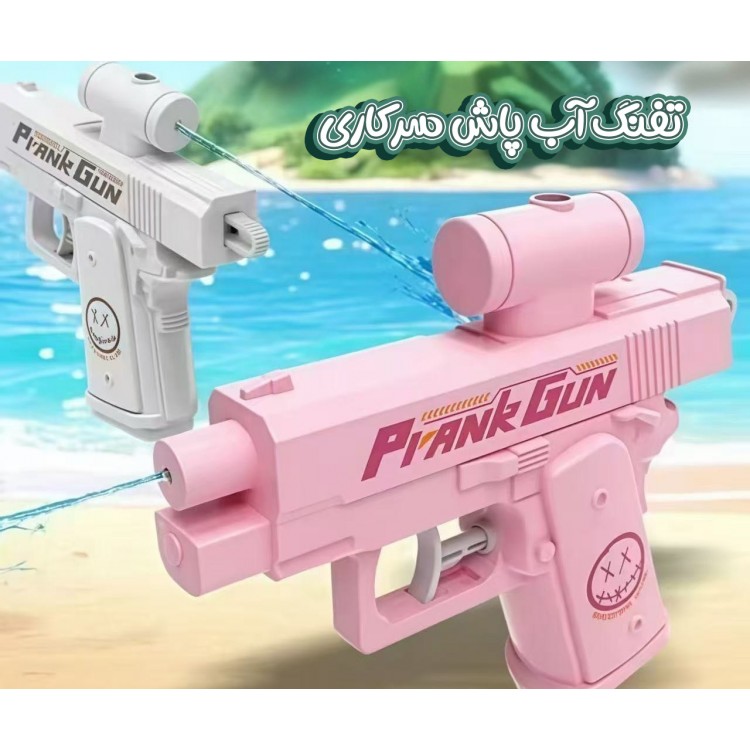 این تفنگ دو تا دکمه داره، دکمه ی انتهایی، آب رو به جلو پرتاب می کنه و میتونید طرف مقابلتون رو خیس کنید، به محض اینکه تفنگ رو بهش بدید تا اونم روی شما آب بریزه به محض اینکه دکمه ی اصلی تفنگ رو فشار بده، از انتهای تفنگ، آب به روی خودش پرتاب میشه !!!