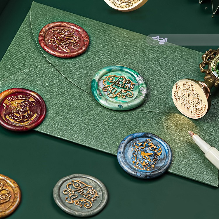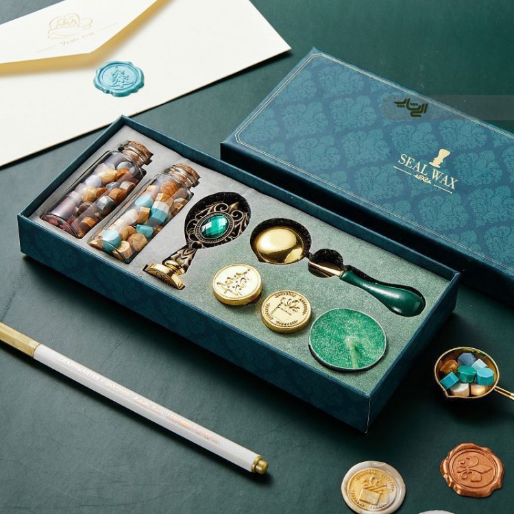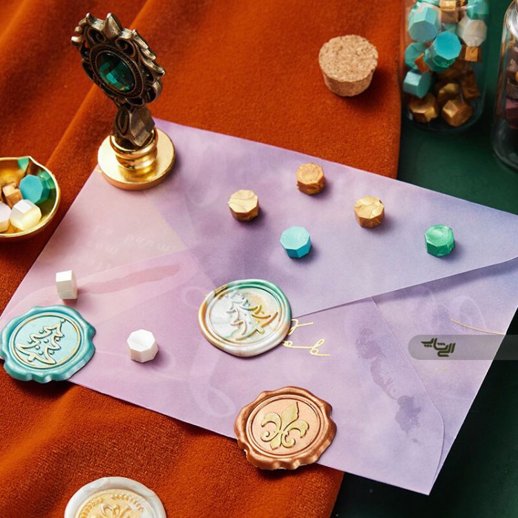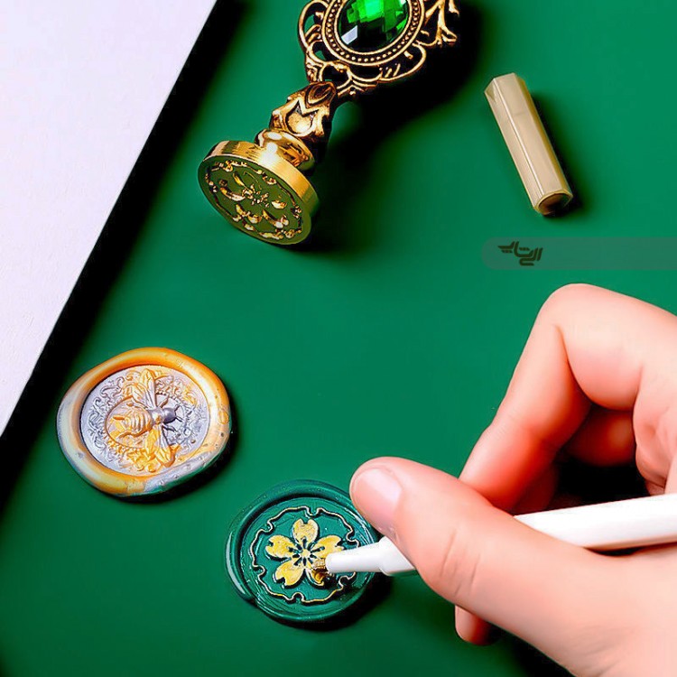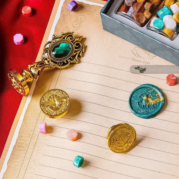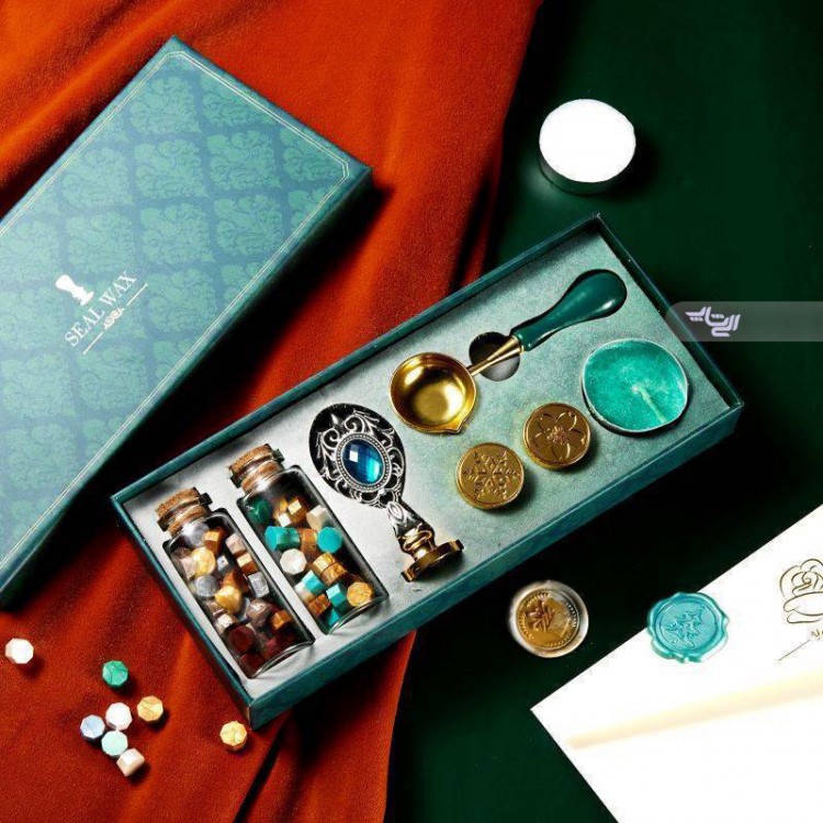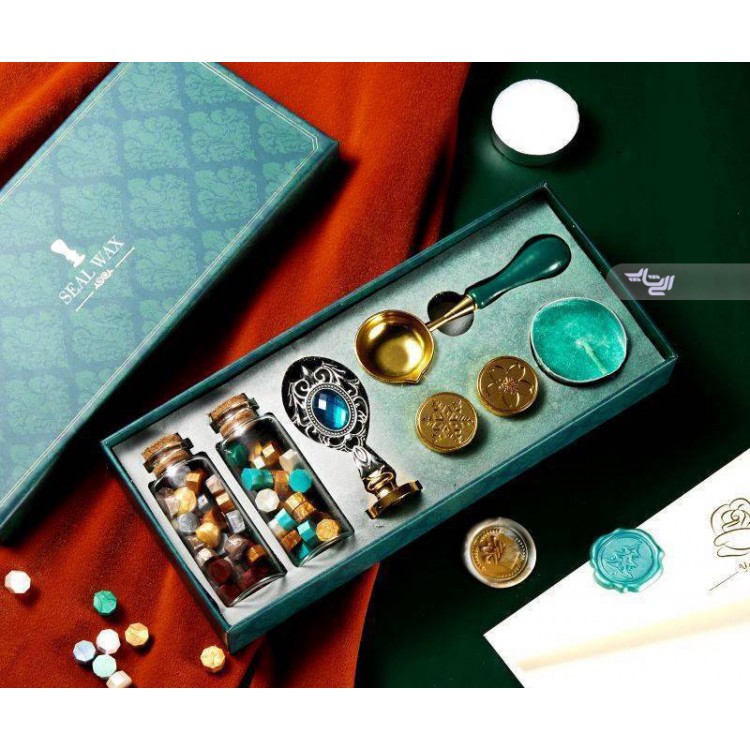 شامل سه عدد مهر برنجی، یک پایه ی مهر، وارمر، قاشقک، دو بطری شیشه ای گرانول مهر و موم، یک ماژیک متالیک طلایی