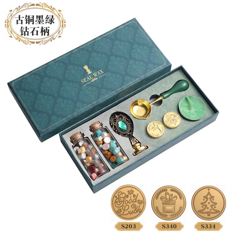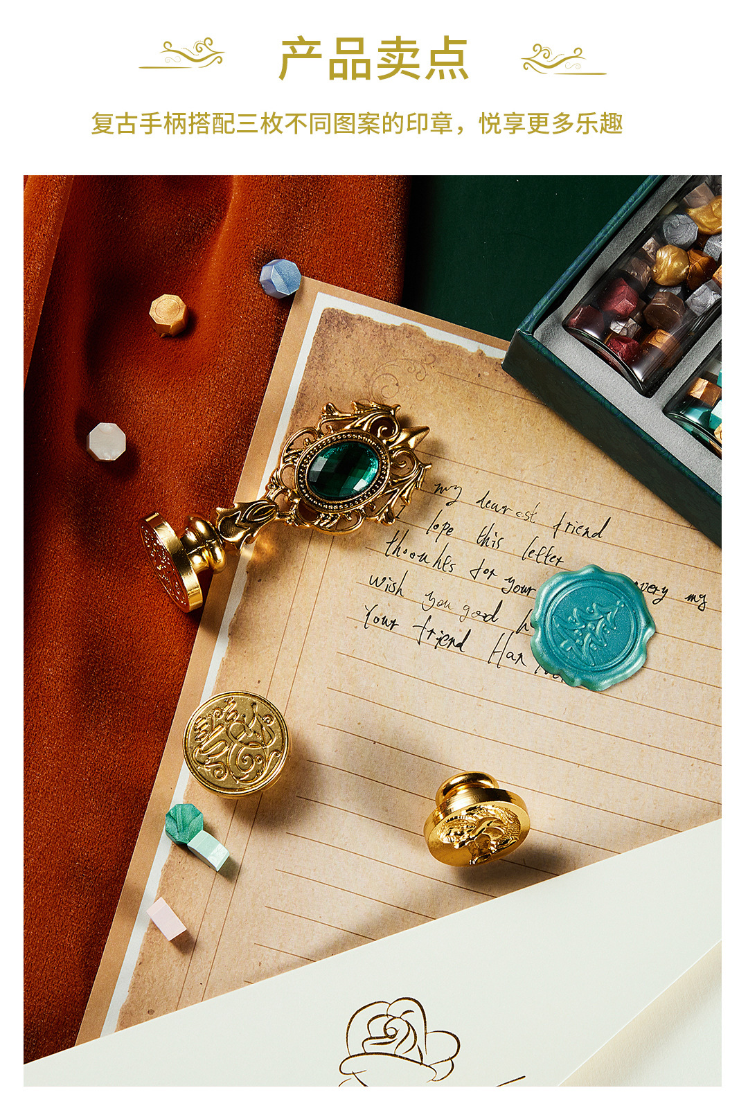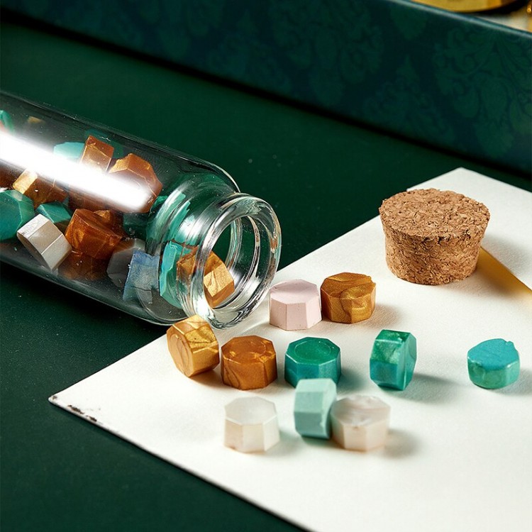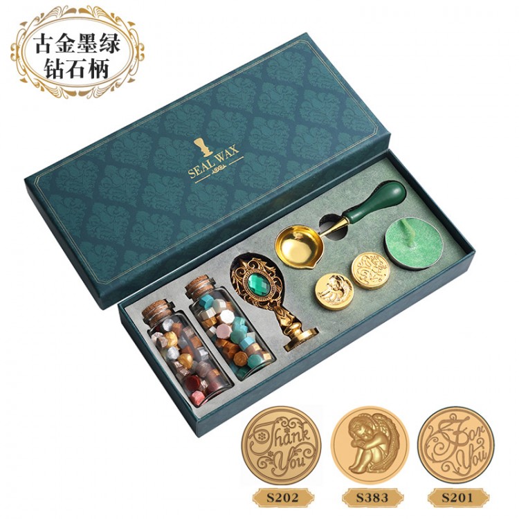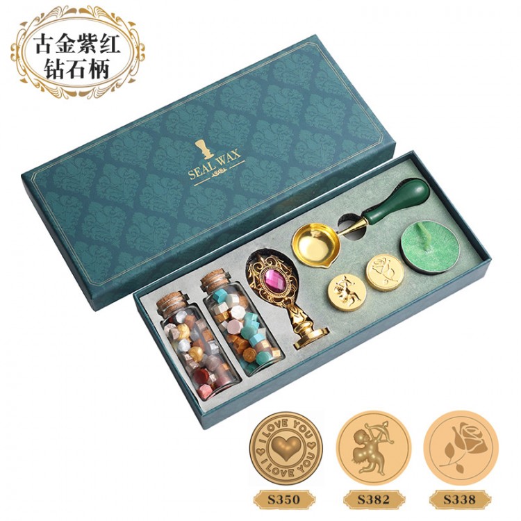شامل سه عدد مهر برنجی، یک پایه ی مهر، وارمر، قاشقک، دو بطری شیشه ای گرانول مهر و موم، یک ماژیک متالیک طلایی