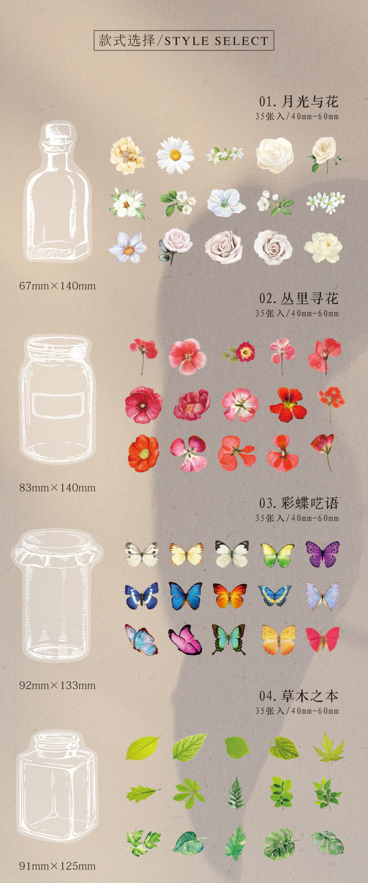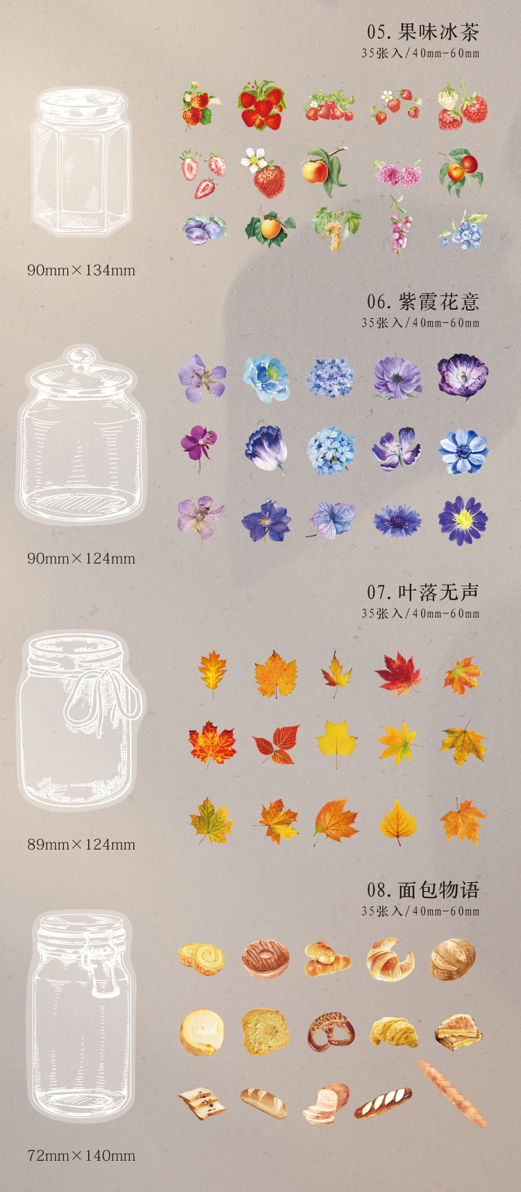 هر ست شامل 15طرح استیکر و از هر طرح دو عدد + 5استیکر طرح بطری (در مجموع 35عدد استیکر)